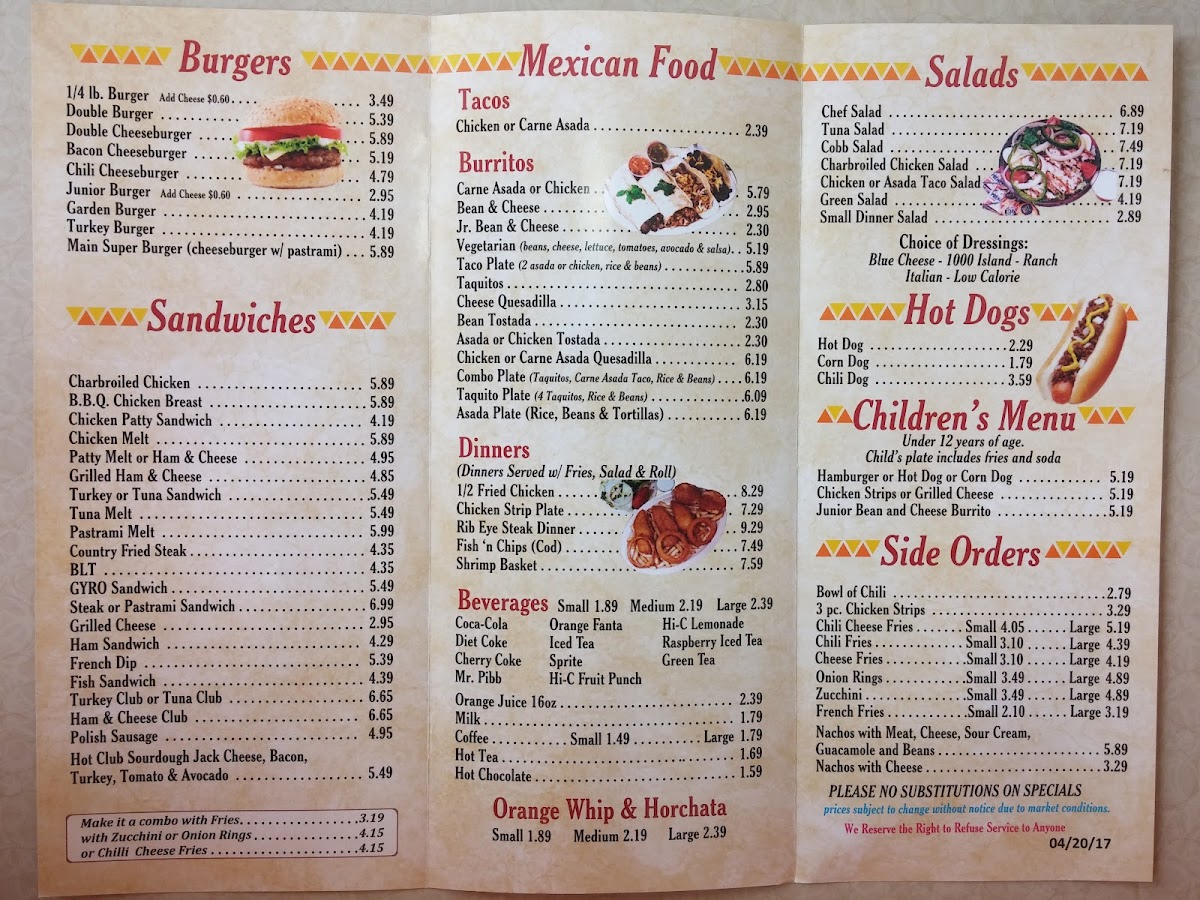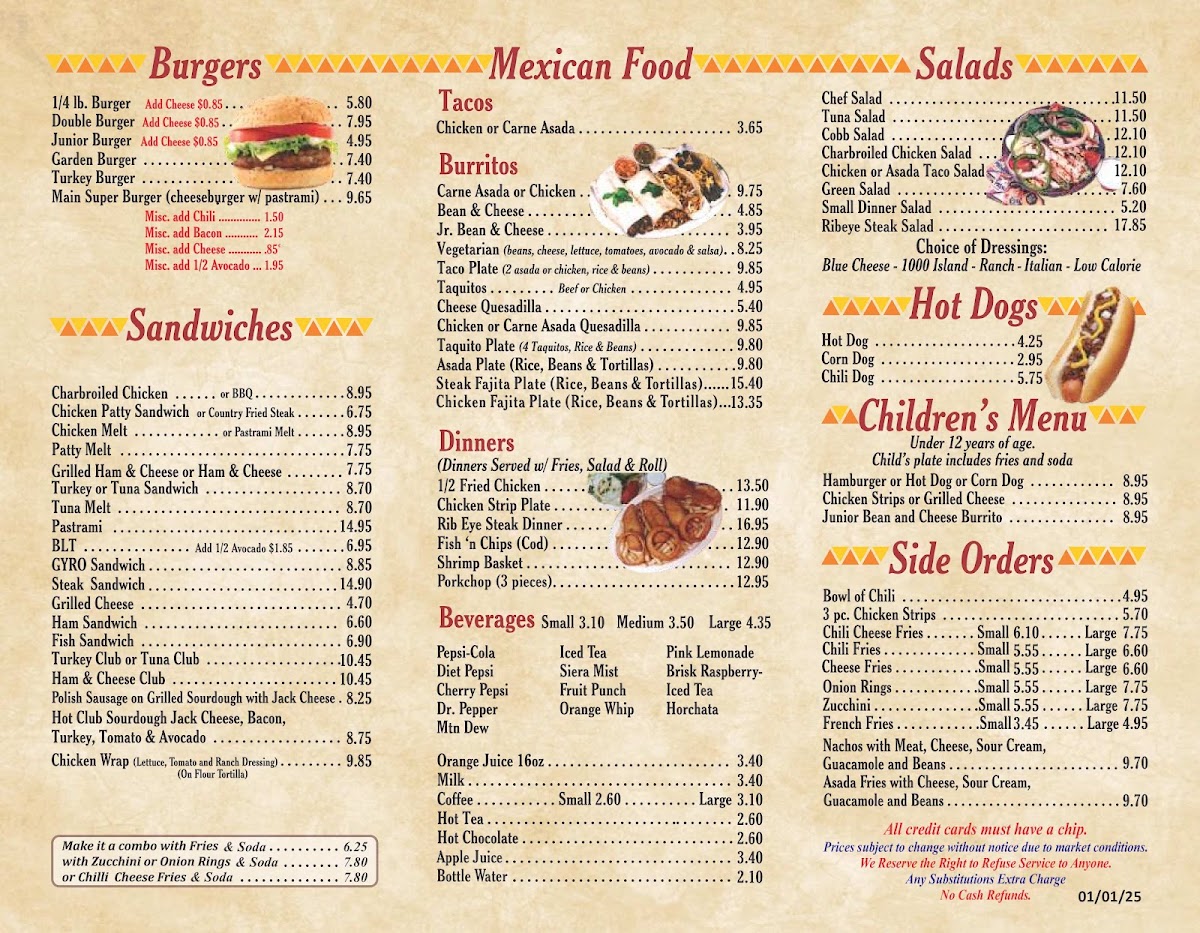 The menu accommodates various dietary preferences with items like a vegetarian burrito and several salad options. There are also selections geared toward children, including chicken strips and corn dogs.